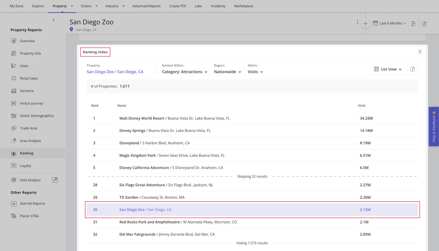 d. The Ranking Index section at the bottom of the page allows for a filtered view of the ranked POIs. In this example, the San Diego Zoo is the 30th most visited attraction in the United States.